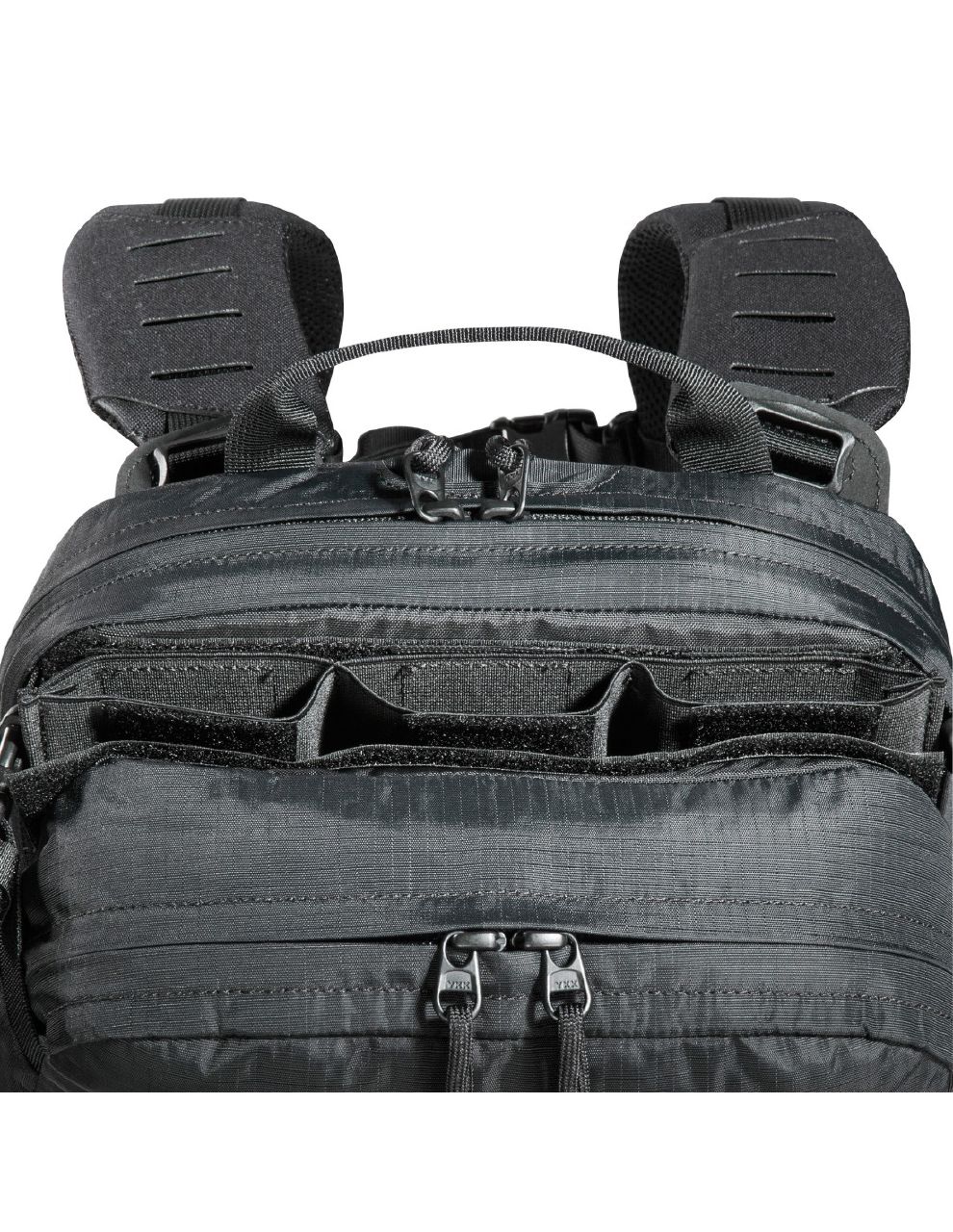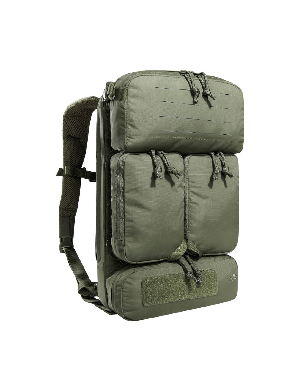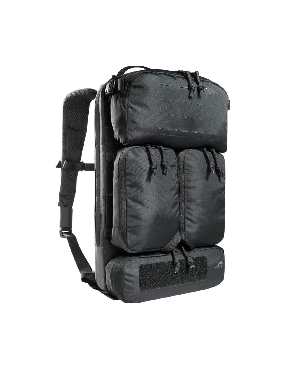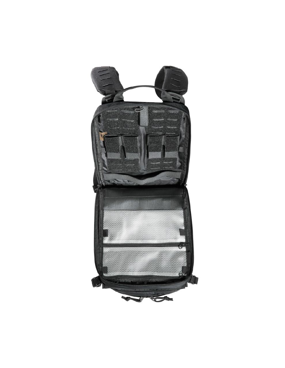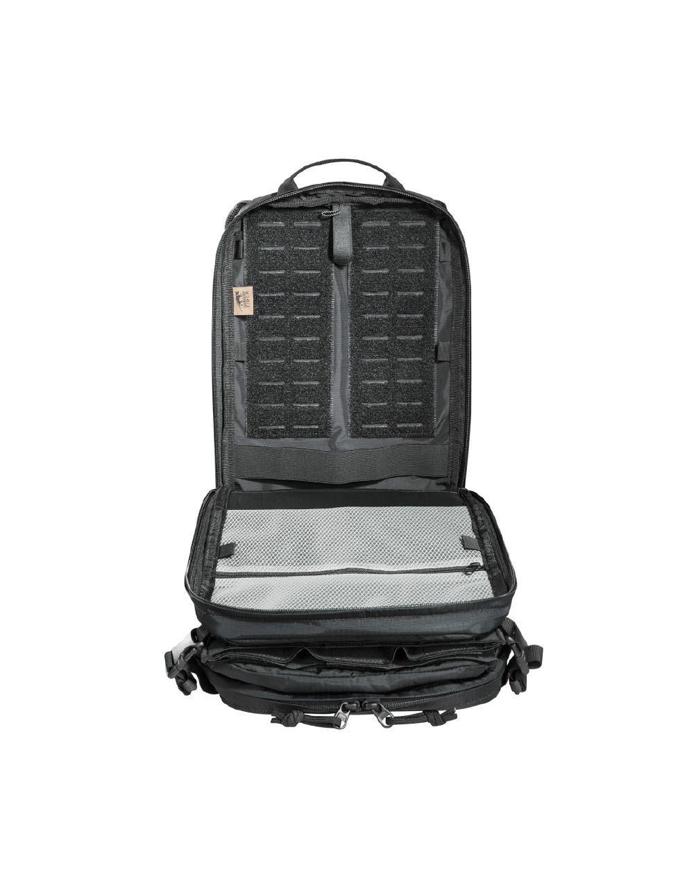 Přední část nabízí odnímatelné kapsy a integrované zásobníkové inserty pro rychlý přístup k výbavě. Díky MOLLE-Reverse systému lze batoh připevnit přímo na plate carrier nebo jinou výstroj.